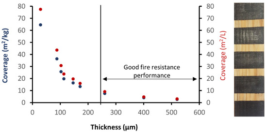 Figure 5 shows the yield (coated area per dispersion unit weight) of the ERG-a dispersion as a function of the thickness of the dry coating. Different thicknesses are easily obtained by diluting the ERG-a dispersion (the first three points (blue or red) from left to right of Figure 4 were obtained diluting the ERG-a dispersion 2.5-fold, 2-fold and 1.5-fold) or by applying successive coats (1 to 6 layers, from the fourth point (blue or red) from the left to the rightmost point). Preliminary tests in the laboratory indicated that flame propagation protection is obtained when the coating thickness exceeds 250 μm.
