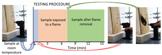 Test protocol to assess coating resistance to flame: the samples were observed for 1 min at room temperature, the flame was applied for 6 min and then withdrawn. Sample observation continued for another 8 min.