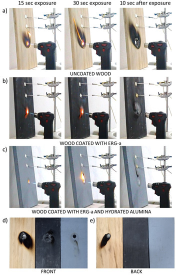 Photos of uncoated wood (a) and wood coated with ERG-a (b) and ERG + hydrated alumina (c) at the times indicated during their exposure to the flame and after the flame removal. The two bottom pictures show the three samples after the test (d,e), allowing the visual assessment of the damage suffered.