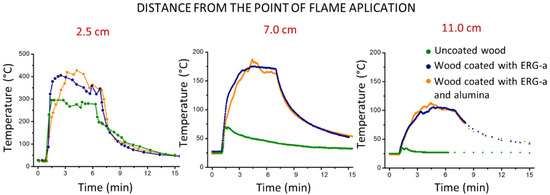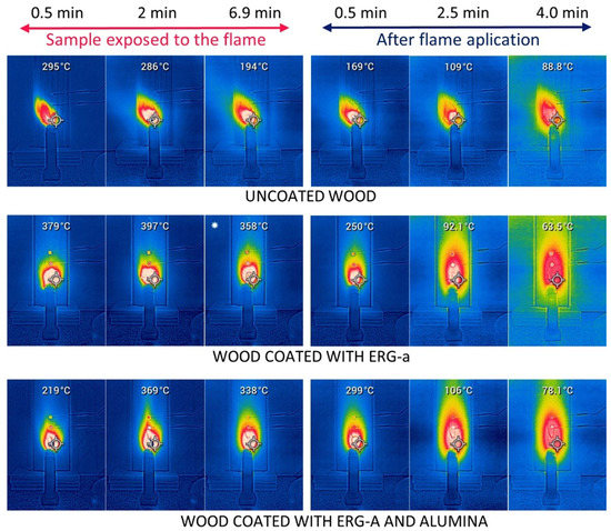 The figures show that the temperature rises very rapidly in unprotected wood and in wood with ERG, but more slowly in wood coated with ERG + alumina, which is explained by the endothermy of the alumina dehydration reaction. However, after two minutes’ exposure, the additional protective effect of alumina is no longer perceived. In coated wood, the temperatures measured outside the point of flame application are much higher than the ambient temperature, while in uncoated wood it is always just above the environment. This demonstrates the effect of the high thermal conductivity of graphite, which dissipates the thermal energy received from the wood by the flame, preventing the gasification of the wood and the inflammation of the gases produced. The high thermal conductivity of graphite also explains the faster decrease of the temperature, after the flame’s contact with the coated wood samples is interrupted.
