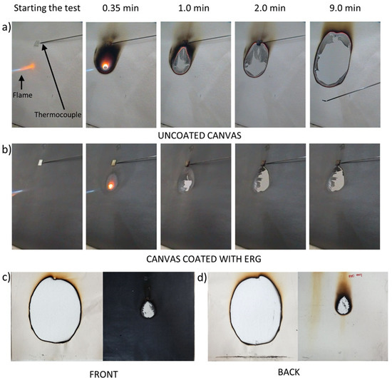 Photos of uncoated raw cotton canvas (a) and canvas coated with ERG (b) exposed to flame. Note that the hole growth in the coated canvas stops 2 min after removing the flame, but it continues indefinitely in the uncoated canvas. The last photo shows the two samples after the test (c,d).