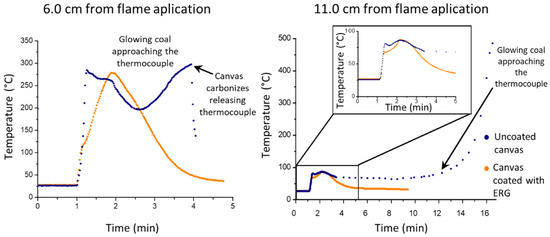 The steep temperature changes in the untreated cloth are expected since the fast burning in the flamed spot produces a hole lined with glowing coal that propagates radially, enlarging the hole. On the other hand, the flamed spot in the ERG-treated cloth never reaches the same high temperatures, thanks to the fast heat transfer along the protective coating. Heat conduction also explains that the damage stops soon after the flame is withdrawn due to fast heat transfer from the burnt area.