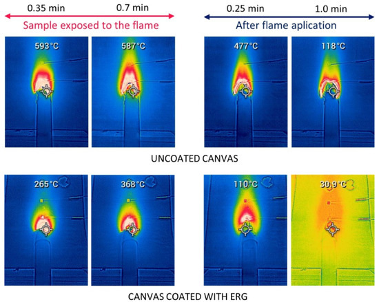 Thermal photos of the surface of untreated raw cotton canvas and ERG-coated canvas. The values shown at the top of the images correspond to the optical readings at 2 cm distance from the flame’s point of incidence.
