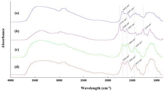 FT-IR spectra of the crosslinked CS films: (a) neat CS, (b) CSCA 1, (c) CSGTA 1, and (d) CSGP 1.