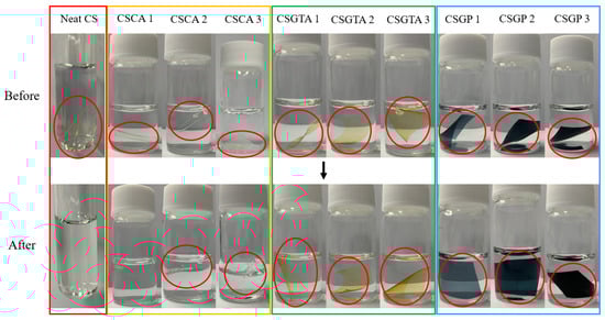 Uncrosslinked CS is soluble in acidic aqueous solutions because primary amine groups of the CS are converted to positive ions (–NH3+) through protonation. Thus, it was assumed that uncrosslinked CS would be soluble under acidic conditions. However, if the CS is crosslinked, the mobility and repulsion of the CS chains decreased, and solvent molecules hardly penetrated the CS molecular chains [,]. These mainly influenced the solubility decrease in crosslinked CS. Figure 2 and Table 2 show the solubility test results of CS films under an acidic condition (pH 2.6). The neat CS film completely dissolved in the acidic aqueous solution, but the CSGTA and CSGP films were insoluble even at a low pH. These results mean that the protonation of amine groups significantly affects the solubility of the neat CS and the crosslinked CS films [].