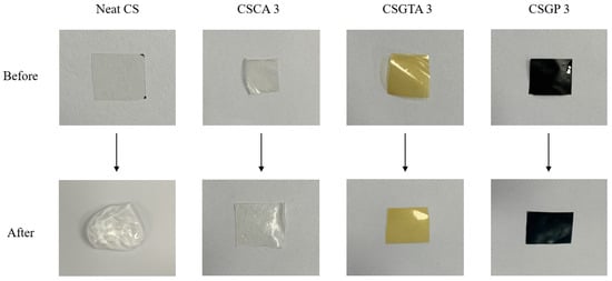 In the case of CSGTA, infrared (IR) peaks were observed at 1564 and 1414 cm−1, corresponding to C=N (stretch) of the imine bond and C–H (bending) between the aldehyde group of GTA and primary amine in CS due to a nucleophilic addition reaction [,]. Likewise, the CSGP showed peaks at 1656, 1564, and 1415 cm−1, corresponding to C=O (stretch)/N–H (bending) of the amide bond and C–H (bending) of the methyl ester group in GP, respectively [,]. However, using only FT-IR spectra to confirm the crosslinking reaction of CSCA, CSGTA, and CSGP films was difficult and insufficient because their IR peaks overlapped with those of the primary amine and newly formed amide bonding of neat and crosslinked CS. Thus, a solubility test was performed to determine whether the CS films were crosslinked or not.