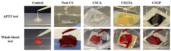 For the whole blood clotting test, 100 µL of canine whole blood was dropped on the crosslinked CS films, which were then stirred slowly to manifest thrombus formation. Similar to the aPTT test, blood clotting time was recorded using a stopwatch until thrombi appeared.