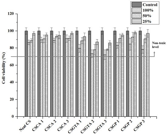 The cytotoxicity of the crosslinked CS films was investigated using an MTT assay. MTT formazan was formed by the reduction reaction of mitochondrial dehydrogenase in living cells. The absorbance of the formed formazan in a DMSO solution at 570 nm was proportional to that of the reduced MTT formazan. Thus, the amounts of living cells and cell viability were deeply related to absorbance changes []. Every crosslinked CS film was immersed in DMEM for 1 day, and the extracted solution was diluted using the same DMEM to 100% from a 25% concentration. Figure 5 shows the cytotoxicity test results of the crosslinked CS samples, among other biocompatibility factors. Even if the concentration of the extracts increased from 25 to 100% of the total volume of the medium, the cell viability of every crosslinked CS sample was at nontoxic levels (above 70%) based on ISO 10993-5 standards. Particularly, although the water-soluble GTA is toxic [,,,], the CSGTA film had good cell viability after washing. Therefore, the crosslinked CS films (CSCA, CSGTA, and CSGP) were biocompatible and thus may be applied in hemostatic patches.