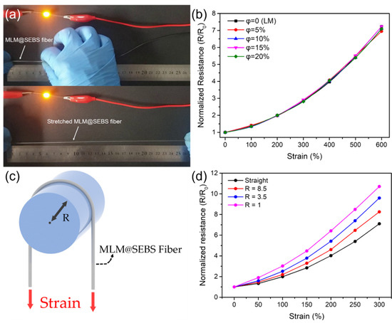 The following are available online at https://www.mdpi.com/article/10.3390/polym13152407/s1, Figure S1: Schematic of MLM@SEBS fiber and the chemical structure of (poly[styrene-b-(ethylene-co-butylene)-b-styrene]) triblock copolymer (SEBS) fiber, Figure S2: Normalized resistance changes of the LM@composite fiber and 5, 10, 15, and 20% MLM@composite fiber as a function of strain, Figure S3: Normalized resistance changes of the LM@SEBS fiber and 5, 10, 15, and 20% MLM@SEBS fiber as a function of strain and bending radius (R), (a) R = 8.5 mm, (b) R = 3.5 mm, and (c) R= 1 mm. Figure S4: Stretching of a knotted 10% MLM@SEBS fiber to 600% strain while maintaining conductivity. Video S1: Stretching of a 5 cm 10% MLM@SEBS fiber to 25 cm while maintaining conductivity. Video S2: Stretching of a knotted 10% MLM@SEBS fiber to 600% strain while maintaining conductivity. Video S3: Activation of a LED by contact with a MLM@SEBS fiber via remote magnetic actuation. Video S4: Switching three LEDs by contact with a MLM@SEBS fiber via remote magnetic actuation.