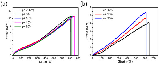 (a) Stress versus strain for the SEBS fibers with the MLM core as a function of iron particle concentration of 0, 5, 10, 15, and 20 wt% in the MLM wire (φ), (b) Stress versus strain for the hollow silicone (Exsil-100) composite fibers with MLM core as a function of iron particle concentration of 10, 20, and 30 wt% in the polymeric shell (ψ).