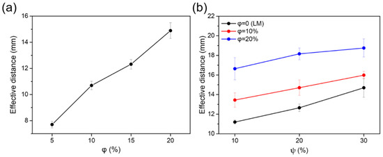 (a) The maximum effective distance between magnet and the hollow SEBS fiber with MLM core as a function of iron particle concentration of 5, 10, 15, and 20 wt% in the MLM core (φ). (b) The maximum effective distance between magnet and the hollow silicone composite fiber with the liquid metal (LM) core and MLM core as a function of iron particle concentration of 10, and 20 wt% in the MLM core (φ) and 10, 20, and 30 wt% in the polymeric shell (ψ).