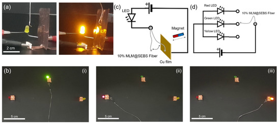Electrical switching of a hollow elastic fiber with the MLM core containing 10 wt% of iron particles. (a) (left) Electrical circuit used for magnetic actuation of the SEBS fiber with the MLM core (MLM@SEBS fiber) before applying magnetic field, (right) LED activation by contacting the fiber with copper plate via remote magnetic actuation, (b) The fiber switched on (i) green LED, (ii) red LED, and (iii) yellow LED via remote magnetic actuation, (c,d) The electric circuit diagrams for (a,b), respectively.