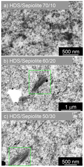 STEM images of nanocomposites synthesized with dual filler: (a) HDS/Sepiolite-70/10, (b) HDS/Sepiolite-60/20 (60/20), (c) HDS/Sepiolite-50/30.
