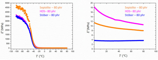 DMA analysis has been performed in order to determine mechanical properties of nanocomposites. Figure 4 shows the evolution of the storage modulus with the temperature in a range from −120 °C and 80 °C at the frequency of 1 Hz for the reference SBR samples containing, respectively, HDS-80 phr, Sepiolite-80 phr, and Stöber-80 phr with same filling degree.