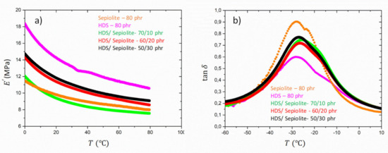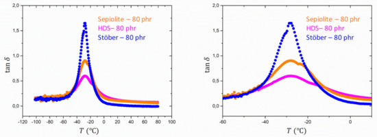 The values of the elastic modulus for the different types of fillers are corroborated by the trend of as a function of the temperature. All samples, as shown in Figure 5, show a prominent peak at −25 °C, attributed to the glass transition. The sample Silica HDS-80 phr shows the lowest intensity peak at . An intermediate peak intensity is observed for sample Sepiolite-80 phr followed by sample Stöber-80 phr, which exhibit the stronger dissipation in proximity of the transition temperature. This behaviour is explained considering the increase of the polymer chain amount involved in the transition. In the case of aggregating fillers like HDS, the degree of freedom of the polymer chains seems to be significantly decreased respective to the case of spherical particles as well as rod-like fillers.