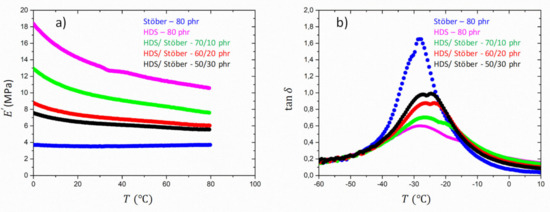 A different trend is instead reported for the mixtures of HDS and Stöber particles. Figure 7 shows the storage modulus and the loss factor as a function of the temperature for Stöber/HDS dual filler compounds.