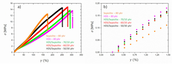 Figure 8 shows the stress-strain curves obtained for the mixtures of HDS and Sepiolite and the two reference samples containing only one type of filler. First, the analysis of the stress at low deformation is indicating that the sample SBR HDS 80 phr has a higher modulus than SBR Sepiolite-80 phr. A value of was estimated for the sample HDS Silica-80 phr, while for the other reference, Sepiolite-80 phr, a value of was found. These values seem to be approximately in agreement with the DMA values observed in Figure 6 at room temperature. For the mixtures, however, a value of was observed, although the DMA experiments revealed clear differences among the moduli in the rubbery regime and, specifically, a significant drop when 10 phr of HDS silica were replaced by Sepiolite. To explain this discrepancy, the different sensitivity of the two techniques has to be taken into account. The tensile test does not allow a clear distinction of the moduli for the mixtures at very low strain as in the case of DMA test, which is instead carried out with a small deformation.