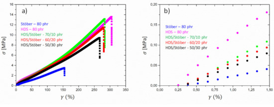 Stress-strain curves for mixtures of Stöber and HDS Silica dual filler compounds in the full deformation range (a) and at low deformation (b).
