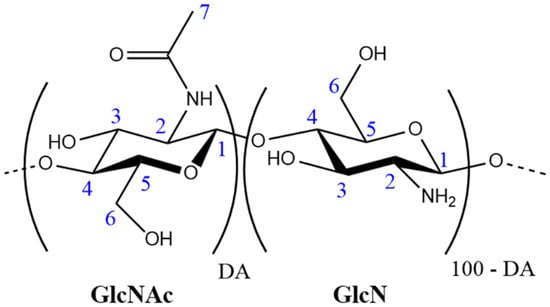 Chitin and chitosan structures showing the acetylated (GlcNAc) and deacetylated (GlcN) units. DA represents the degree of N-acetylation, for chitin DA = 100.