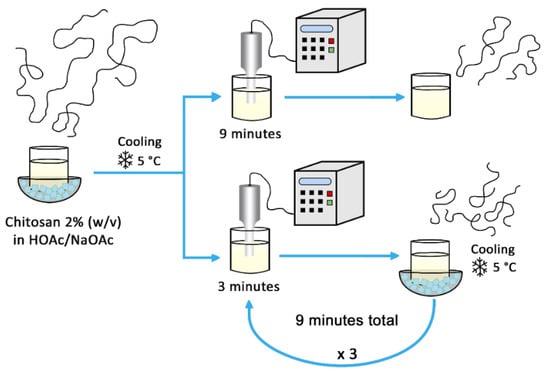A 2% chitosan solution (w/v) was prepared as above with the same buffer (pH = 4.5) and chilled in an ice bath to 5 °C. One portion of the solution was exposed for 9 min to ultrasound produced by a Sonics sonifier VCX 750 (frequency of 20 kHz) with a Cv334 sonotrode (model 630-0219, probe diameter = 13 mm, length = 139 mm, with an amplitude of 40%). The probe was immersed in the sample up to 15 mm from the bottom of the reactor (diameter = 49.2 mm, height = 66 mm). The other portion of the chitosan solution was exposed to ultrasound for 3 min, followed by cooling and stirring in an ice bath (for 15 min, until it reached 5 °C), the sample was then exposed to ultrasound again for 3 more minutes, cooled down and, finally, it was exposed for 3 more minutes to ultrasound. In this way, both chitosan samples were exposed to ultrasound for a total of 9 min, as the scheme in Figure 2 shows. MWs were determined by GPC.