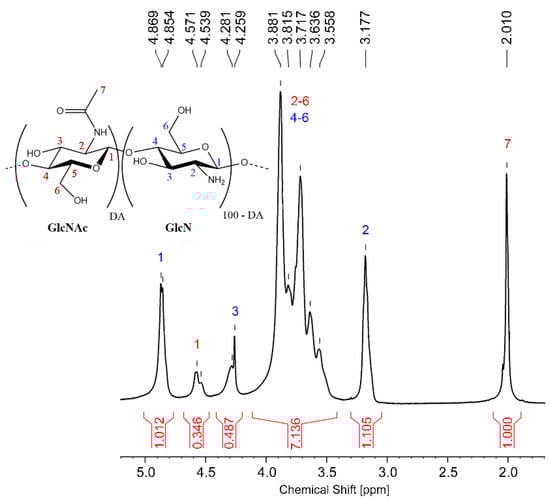The standard test for determining the degree of N-acetylation of chitosan by 1H-NMR from the ASTM (F2260-18) was used. This method is valid for chitosan soluble samples in the range of DA from 0 to 50% [19]. Samples were analyzed at 70 °C to reduce their viscosity and change the chemical shift of the solvent (H2O). The proton assignment can be observed in Table 1.