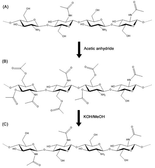 Chitosan acetylation has been performed with different reagents, such as acetyl chloride in ionic liquids [22,23]; however, acetic anhydride has been used the most and usually reacted with chitosan in aqueous acetic acid solutions [24,25,26] (and in mixtures with alcohols and bases [27,28,29,30,31,32,33,34]), at room temperature and for several hours. It has been claimed that the presence of the alcohol in the media aids the reaction of the free amino groups in chitosan with long aliphatic chain anhydrides, and the selectivity of N-acetylation instead of O-acetylation. There is evidence that the reaction of chitosan with acetic anhydride can result in chains with a wide range of DAs, even up to 100% acetylation, with high reaction yields (85 to 95% of the recovered mass of the product [31]).