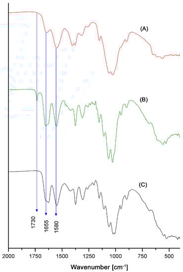The reaction pathway shown in Figure 4 was verified qualitatively by IR spectroscopy as is shown in Figure 5. In this figure, FT-IR-ATR spectrum A corresponds to the initial substrate (chitosan Q24) and spectrum B corresponds to the fully acetylated product showing an increase in the intensity of the band at 1655 cm−1 (which corresponds to the vibrations of the C=O bond in the amide groups) due to the presence of more N-acetylated glucosamine units [38]. Spectrum B also shows a new band at 1730 cm−1 which is associated with the stretching of the C=O bond in esters (produced by O-acetylation). Spectrum C in Figure 5 evidences the selectivity of the hydrolysis of the ester groups with methanolic KOH by the disappearance of the ester C=O band, while the band for the amide C=O at 1655 cm−1 remains unchanged.