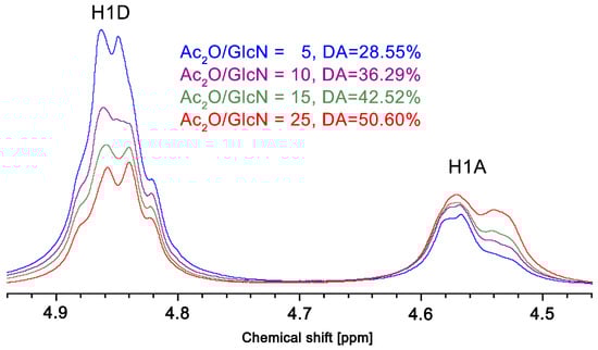 Figure 6 shows the 1H-NMR spectra of the products from the acetylation of Q10 with different ratios of Ac2O/GlcN. The peak labeled H1D that appears at 4.85 ppm corresponds to the anomeric hydrogen atom in the deacetylated repeat unit (GlcN), while the signal al 4.55 ppm (labeled H1A) is due to the anomeric hydrogen in the N-acetylated repeat unit. From the spectra shown, it is apparent that the intensities of the peak corresponding to the deacetylated unit (H1D) decrease as the Ac2O/GlcN ratio goes up and, at the same time, the peak of the acetylated unit (H1A) increases in intensity. This shows, as expected, that more N-acetylation occurs when more acetic anhydride is used.
