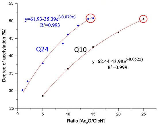Relationship between the Ac2O/GlcN molar ratio and the DA of the acetylated chitosans Q10 and Q24 (data in circles correspond to partially insoluble products).