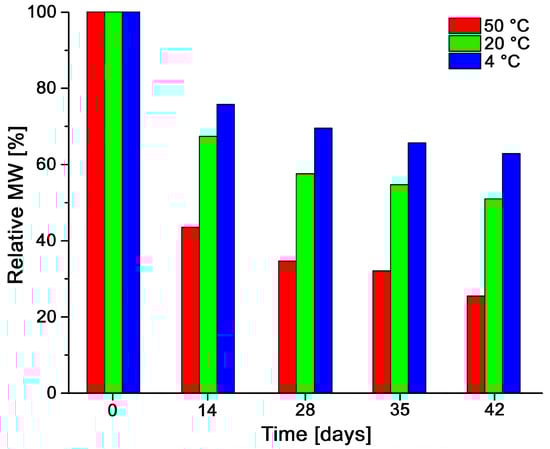 Chitosan was dissolved in an aqueous buffer solution of pH 4.5 (0.2 M HOAc/0.1 M NaOAc) to form a 1.5 mg/mL solution. The solution was divided into three portions that were kept at 4 °C, 20 °C and 50 °C for 42 days. Aliquots were taken from each portion every seven days and analyzed by GPC for MW determination.