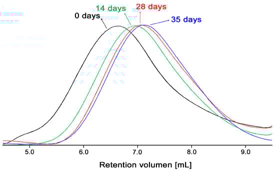 GPC chromatograms of chitosan stored at 50 °C for 0, 14, 28 and 35 days.