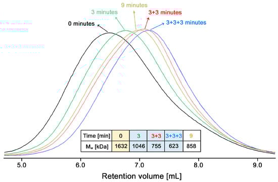 GPC chromatograms of chitosan treated with ultrasound for 9 min straight and for a sequence of three 3-min treatments.