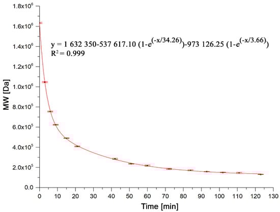 The MW of chitosan samples treated with ultrasound for up to 123 min (forty-one 3-min treatments) is presented in Figure 11. As can be seen, ultrasound treatment applied to a high MW chitosan in solution produced a rapid shortening of the chains and is dependent on the exposure time to ultrasound, as expected. The rate of degradation is high and corresponds to that of a chitosan solution concentration well above the overlap and entanglement concentrations of a high MW chitosan, as explained by Wu et al. [45]. An exponential equation that roughly fits the data can be used to estimate the treatment time needed to produce any desired MW. The lowest MW obtained was 131 kDa, a 92% reduction in MW of the original polymer. Similar graphs have been reported by Popa-Nita et al. and also Wu et al. [45,47], each for different experimental conditions.