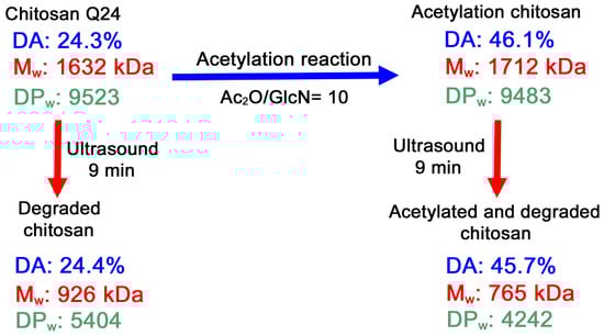 Finally, as an example of the versatility of the methods studied, Figure 12 shows a scheme in which chitosan Q24 (DA 24.3%, 1632 kDa, DPw 9523) is transformed into three other products, a more acetylated chitosan (DA 46.1%) with roughly the same DPw (9483), a chitosan with the same DA but with lower MW (DPw 5404) and a chitosan with a higher DA and lower MW and DPw (DA 45.7%, 765 kDa, 4242). This simple approach to control the DA and MW of chitosan could serve as a starting point to industrially synthesize tailor-made products and reference materials.