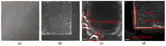 A comparison of the embossing quality with and without impedance-based control is shown in Figure 9. The results shown in Figure 9a are from an ultrasonic amplitude of 29.6 µm, where distinct and flat grating lines can be seen (this result is consistent with the structures shown in Figure 10b and Figure 11b). The quality of the vibrations was not as satisfactory when the amplitude was too great (vibration amplitude: 40.7 µm, see Figure 9b). This is because when the polymer reached the embossing temperature, the amplitude remained large, making it difficult for the viscous fluid to enter the structural cavity. At the same time, some parts of the embossed samples had defects (as shown in Figure 9c), indicating that some over-embossing had occurred. It is possible for the stamp to be entirely embossed into the polymer if the impedance control method is not applied (as shown in Figure 9d). This is because when the temperature rises to embossing temperature at 30 µm, the amplitude is usually just around 1 s, after which the polymer will be in a viscous, rubbery condition and the temperature will not drop as quickly as the vibration is maintained. It will be easy to press the stamp into the polymer because it has been pre-pressured.