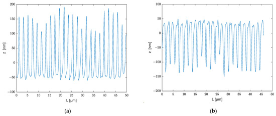 The structures exhibited in Figure 13b and Figure 14b are of relatively poor quality in comparison to the micron structure in Figure 10b and Figure 11b. It is difficult to emboss grating lines with structures of tens to hundreds of nanometers. Figure 14b shows that the average height of the upper surface can reach 40 nm, which is similar to the depth of the lower surface in Figure 14a, suggesting that ultrasonic assisted embossing can potentially fill submicron grooves. However, there is a significant discrepancy on the bottom surface, with the better side reaching 150 nm and the poorer side barely reaching 50 nm. There are two likely causes for this: poor die quality of the stamp (see Figure 13a and Figure 14a) or material shrinkage during the cooling phase from embossing temperature to room temperature, which causes some of the lines to vanish.