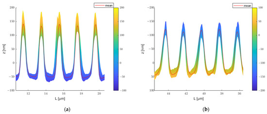 Since the mold and embossed polymer have flipped shape contours, the profiles embossed on polycarbonate in Figure 11 have been flipped for a better comparison. Figure 12 exhibits the variety of profiles in a 45 µm slice of micrometer tool, as well as the polycarbonate embossed with it. The displayed ranges are 153–198 μm and 125.5–170.5 μm. The average depth is represented by the red line in the diagram. The contours in the figures indicate the error range of this grating line.