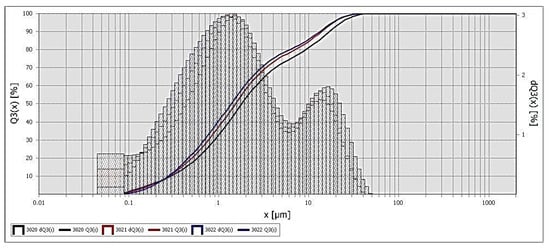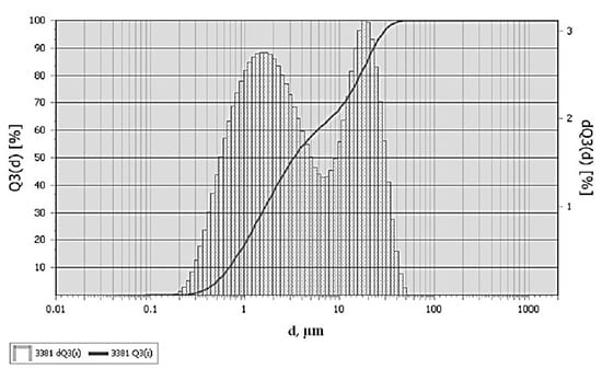 The fractional composition of diorite is represented by particles from 0.2 to 50 μm, with average particle sizes of 1–2 and 20–25 μm, Figure 2.