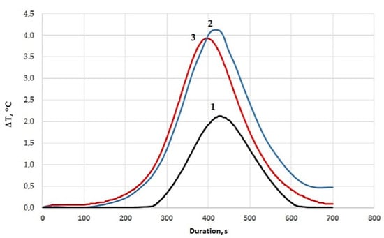 Figure 6. Differential scanning calorimetry of epoxy compositions: 1—100 ED-20 + 40 ORPP + 15 PEPA; 2—100 ED-20 + 40 ORPP + 0.1 Diorite + 15 PEPA; 3—100 ED-20 + 40 ORPP + 50 Diorite + 15 PEPA.