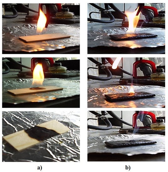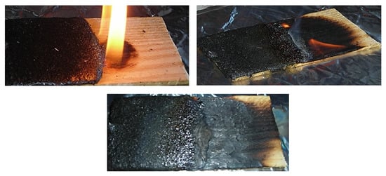 When determining the speed of flame propagation over the wood surface without a fire-resistant coating and with a fire-resistant coating, it was found that the uncoated wood ignites in 15 s and combustion continues after the gas burner is removed, the flame propagating in the longitudinal and transverse directions at a speed of 30 mm/min, as shown in Figure 7a. Wood with a fire-retardant coating ignites in 45 s; however, the flame extinguishes automatically in 10 s after the gas burner is removed, as shown in Figure 7b.