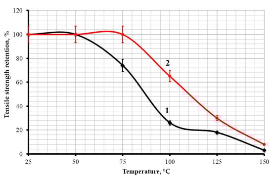 Figure 9. Dependences of the tensile strength index of the epoxy composite on the test temperature: 1—100ED-20 + 40ORPP + 15PEPA; 2—100ED-20 + 40ORPP + 50Diorite + 15PEPA.
