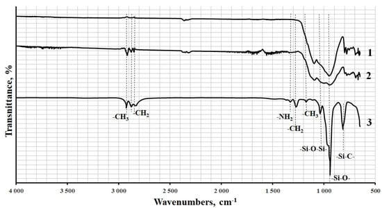 The presence of the interaction between the APTES amine groups and the ED-20 epoxy groups was proved earlier [22]. After the APTES treatment of the diorite surface, there appear vibration peaks corresponding to APTES in the IR spectra of functionalized diorite, as shown in Figure 11. Besides, a peak appears at 1040 cm−1, which is connected with the formation of a non-hydrolysable -Si-O-Si- bond, which remains after washing the functionalized diorite with water, thus confirming the chemical interaction between the functional groups of APTES and diorite.