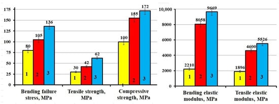 Figure 12. Physicomechanical characteristics of epoxy composites: 1—100 ED-20 + 40 ORPP + 15 PEPA; 2—100 ED-20 + 40 ORPP + 50 Diorite + 15 PEPA; 3—100 ED-20 + 40 ORPP + 50 Diorite(APTES) + 15 PEPA.