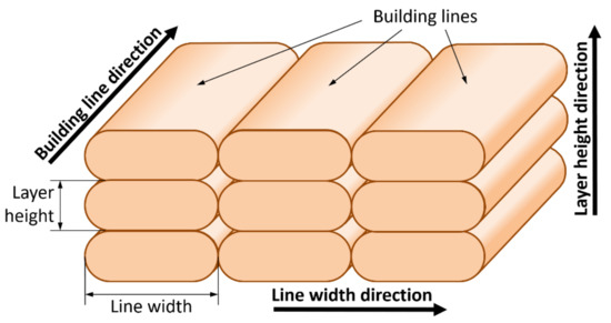 ABS samples were manufactured using an Ultimaker 3 Extended printer (Ultimaker B.V., Gerdelmalsen, The Netherlands) equipped with a 0.4 mm-diameter nozzle. All building lines of each specimen have been printed without differences between infill lines, wall lines and bottom and top layer lines. A unidirectional raster orientation with a 100% density infill line pattern was chosen. In the fabrication process, the following values were used: printing speed of 60 mm/s, temperature of 240 °C and build plate temperature of 80 °C. In order to reduce the interaction between lines of the same layer, a layer height of 0.2 mm and a line width of 0.5 mm were chosen (Figure 2).