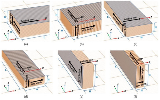 For each internal geometry, the directions of each dimension of the building lines (Figure 2) can be related to directions of the outer dimensions of the sample: length (L), width (W) and height (H) (Table 1).