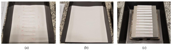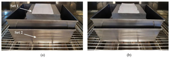 The samples set were introduced on a dry alumina powder bed inside a non-stick steel container (Figure 4a) and they were covered with an upper-layer alumina powder (Figure 4b), forming a ceramic mould around specimens in order to avoid deformations due to creep. A one-centimetre-thick alumina powder was used in both layers. Other samples were placed outside the mould (Figure 4c) to compare mould effectiveness. Samples are packed in aluminium oxide powder with granulometry of 150 micrometres and 99.78% purity (Protechno, Girona, Spain). The powder granulometry used was lower than layer height to ensure that no details were lost from the part surface. Ceramic powder was packed around the specimens with a pressure of 12 g/cm2, forming an expendable mould. For this purpose, another steel container with a metal plate of 7 kg was placed on top, covering the entire surface of the ceramic powder. To ensure constant pressure in the mould, the metal plate was maintained throughout the thermal process. No binding agents were used because the pressure was enough to ensure that the ceramic powder behaved as a solid.