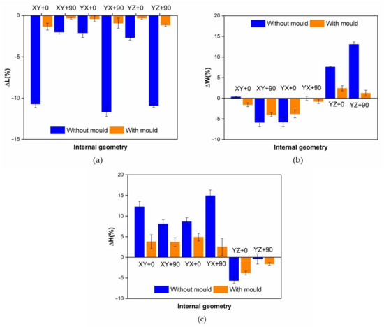 As shown by the ANOVA and bar charts (Figure 7), a strong influence of internal geometry on the dimensional variations of samples was observed. Samples made with building lines in the main sample direction (XY + 0, YX + 90 and YZ + 90 samples) show five times more length deformation than the samples made with building lines in a perpendicular direction to the main sample direction (XY + 90, YX + 0 and YZ + 0). If a mould is used, three times longer deformation is shown. Attending to width (W) deformation, samples with building lines in the direction of the width of the part (XY + 90 and YX + 0) present elevated shrinkage. In samples with building lines in the height direction (YZ + 0 and YZ + 90), shrinkage only appears in this direction. It can be concluded that there is a relationship between building line directions and the shrinkages in the part.