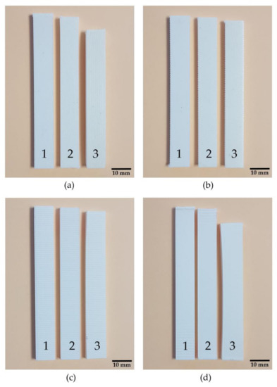 Specimen comparison before thermal process (1), after thermal process with mould (2) and after thermal process without mould (3). (a) XY + 0 Samples; (b) XY+90 Samples; (c) YZ + 0 Samples; (d) YZ + 90 Samples.