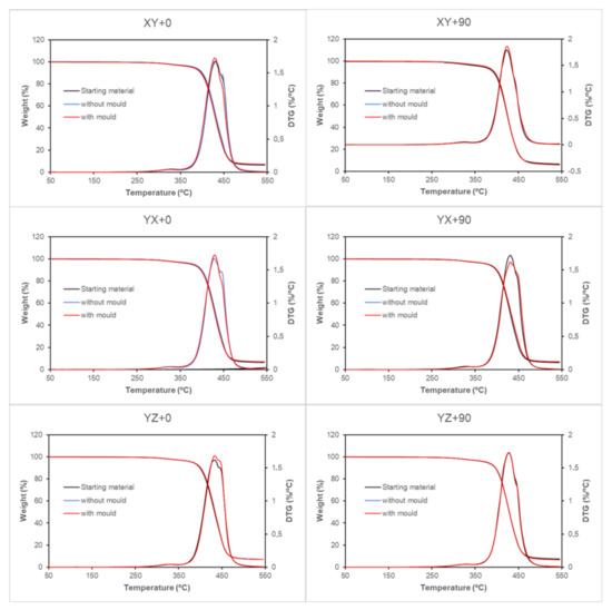 TG/DTG curves of ABS samples at 10 °C min−1 in nitrogen atmosphere. Specimens comparison before thermal process, after thermal process with mould and after thermal process without mould for XY + 0, XY + 90, YX + 0, YX + 90, YZ + 0 and YZ + 90 samples.