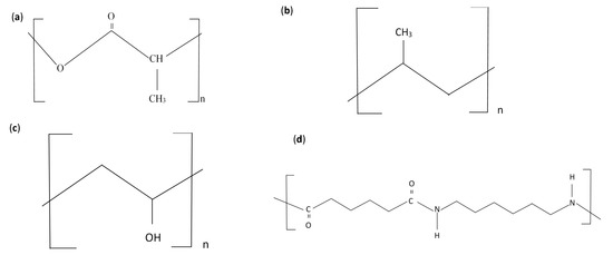 Polymer structures of (a) PLA, (b) PP, (c) PVA, and (d) nylon 6,6.